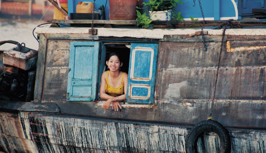 The rest of the day, we'll have a fun cruise, going by Phnom Penh's skyline and moving into the smaller Tonle River, heading north. Look forward to a multi-course dinner and a movie night for entertainment. We'll anchor in the middle of the Tonle River.