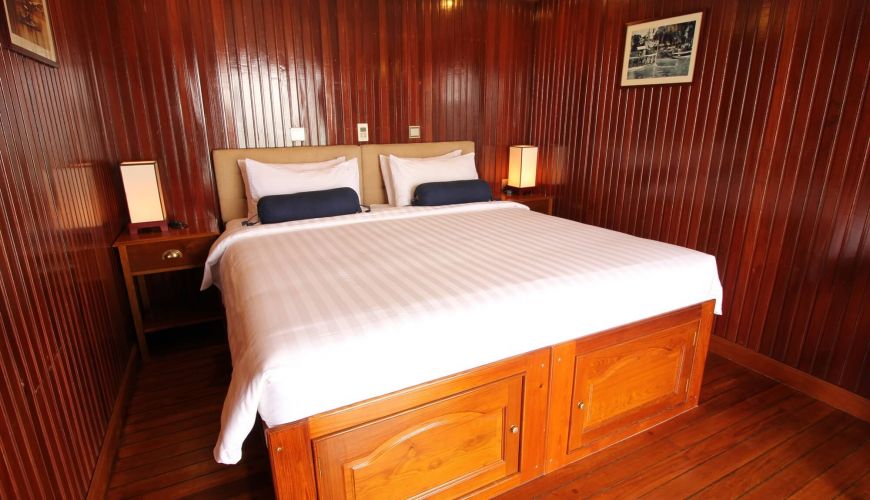 Located on the Upper Deck, there are 18 cabins at the area of nearly 16 square meters. All the rooms are furnished with the Panoramic French window which offers a great view of the Mekong River from your cabin. There are also convertible bed configuration, bathroom with natural stone shower and branded quality fittings.