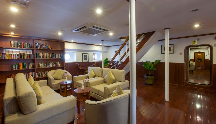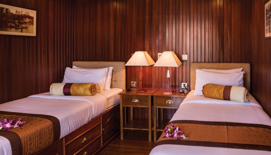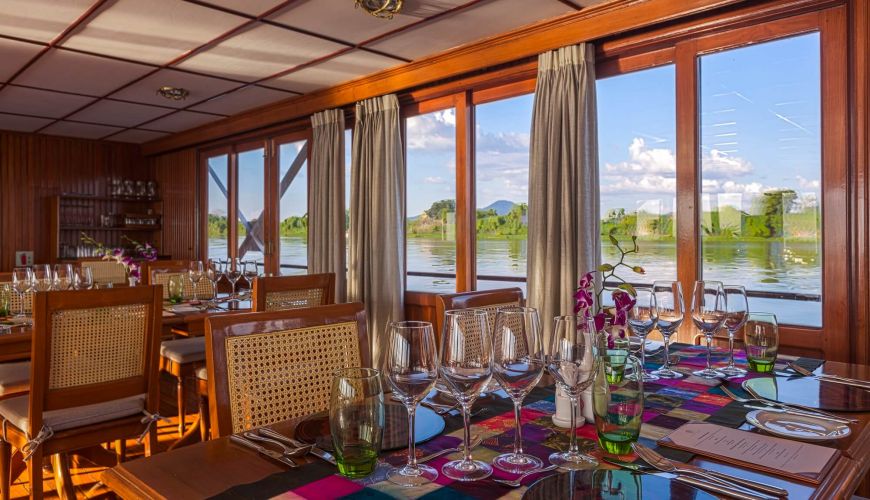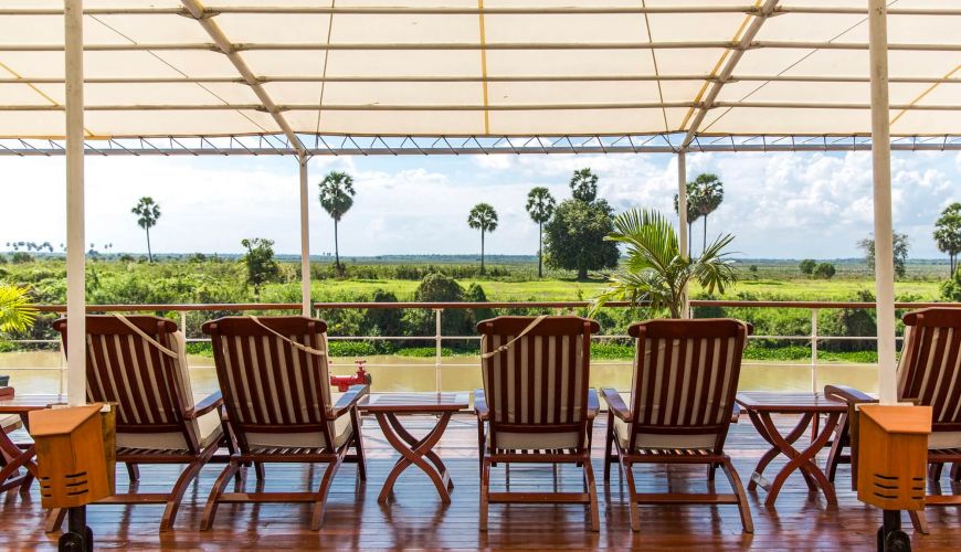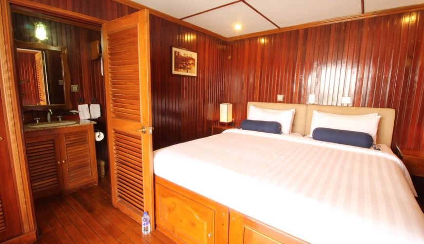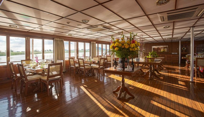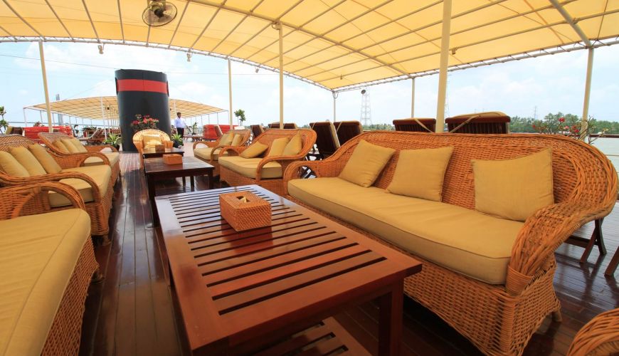 Located on the Upper Deck, there are 18 cabins at the area of nearly 16 square meters. All the rooms are furnished with the Panoramic French window which offers a great view of the Mekong River from your cabin. There are also convertible bed configuration, bathroom with natural stone shower and branded quality fittings.