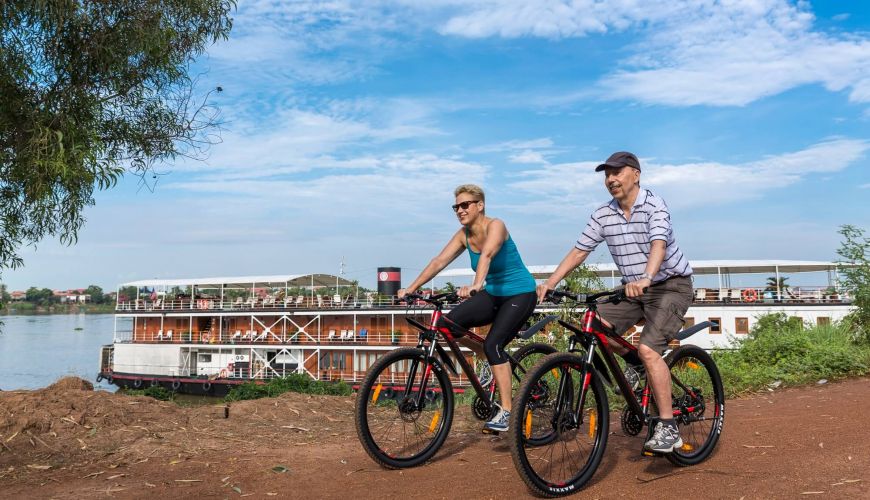 We'll take a bus from Siem Reap to Kampong Cham to get on the ship. Enjoy a sunset boat ride on the Mekong and say hello to the crew you'll be with for the next 7-night-cruise.