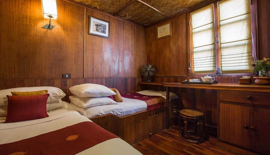 The upper deck offers 2 cabins with twin beds. The cabins provide excellent view over the Mekong River in Laos. Each one is fully equiped with standard facilities, including air-conditioner with a fan for optimum temperature control, and private bathroom along with pleasant hot shower and Western-style toilet.