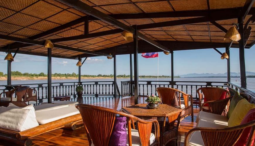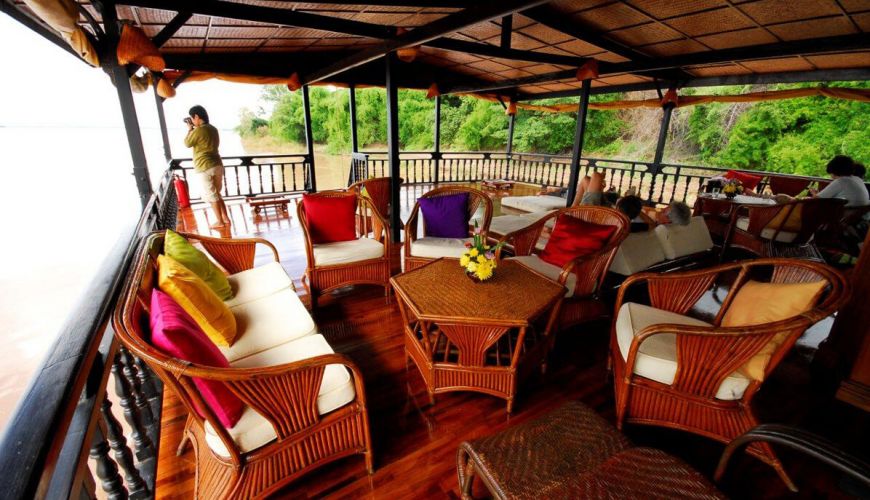 The lower deck provides 10 cabins with twin beds. Each cabin has nice view over the Southern Mekong in Laos. All cabins are fully equiped with air-conditioners and fans for optimum temperature control. Dressing tables and wardrobe are available for your unpacking. Every cabin includes private bathroom with hot shower and Western-style toilet to suit your need.